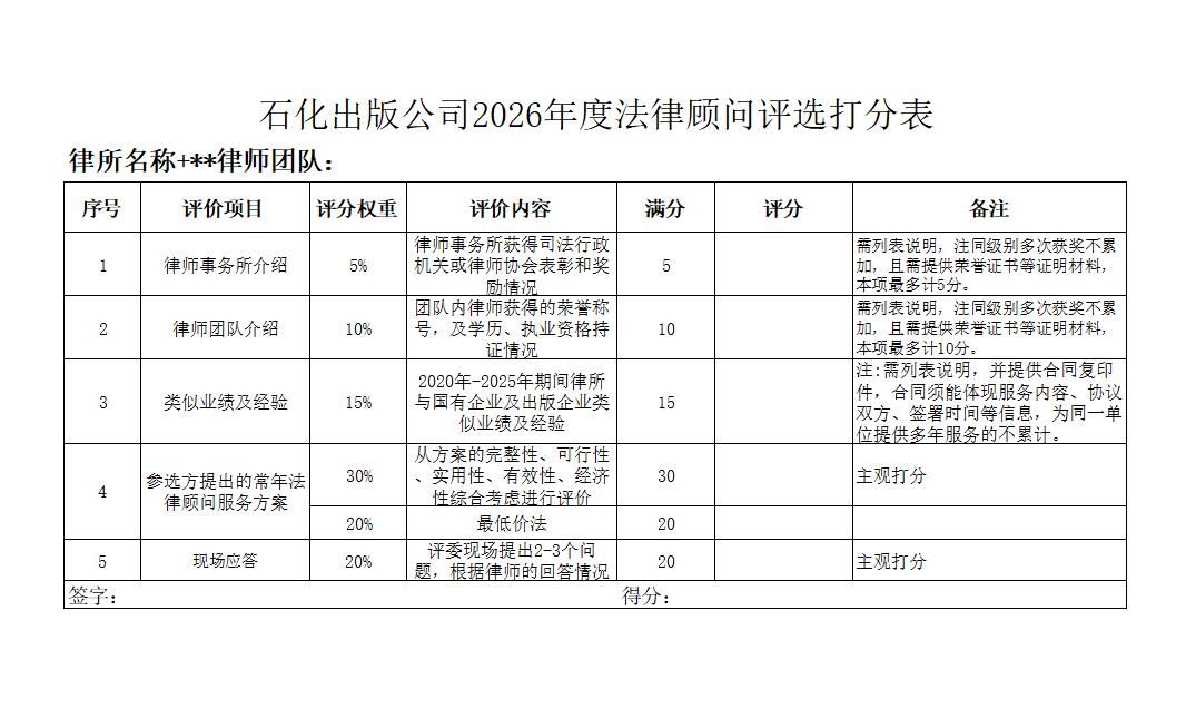 为规范石化出版公司法律顾问评选工作,确保评选过程的公开、公平、公正,提高法律服务质量,提高公司依法合规管理能力,特发布该公告,公开招募并评选2026年度石化出版公司法律顾问。